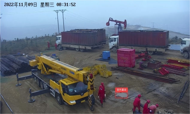 該項目采用邊緣端方案,部署鯤云AI視頻分析平臺,接入了現場的300路視頻,對油田生產過程中原油泄漏及漏油面積計算、安全帽檢測、紅色工作服識別、采油設備運行狀態識別、非法入侵等作業風險及違規行為進行智能識別檢測,有效杜絕安全生產隱患。